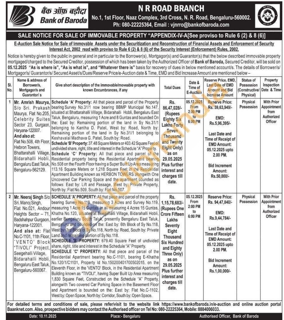 SCHEDULE 'A' PROPERTY: All that piece and parcel of the property bearing Survey No. 118, measuring 3 Acres and Survey No.119, measuring 1 Acre 15 Guntas, in all measuring 4 Acres 15 Guntas, Khatha No. 120, situated at Seegehalli Village, Bidarahalli Hobli, earlier Bengaluru South Taluk, presently Bengaluru East Taluk, Bengaluru and bounded on the: East by: 6th Block of Sy No.118. West by: 3rd Block of Sy No.118, North by: Road, South by: Private Land and remaining portion of Sy No. 118. SCHEDULE 'B' PROPERTY: 679.40 Square Feet of undivided share, right, title and interest in the Schedule "A" Property. SCHEDULE 'C' PROPERTY: All that piece and parcel of the Residential Apartment bearing No.C-1101, bearing E-Khatha No. 120/1/C1101, Property Id No.150200401700502015, on the Eleventh Floor, in the 'VENTO' Block, in the Residential Apartment Building known as "TIVOLI", having Super Built Up Area measuring 1,830 Square Feet, Constructed on the Schedule "A" Property, alongwith Two covered Car Parking Space in the Basement Floor and Apartment is bounded on the: East by: Flat No.C-1102, West by: Open Space, North by: Corridor, South by: Open Space