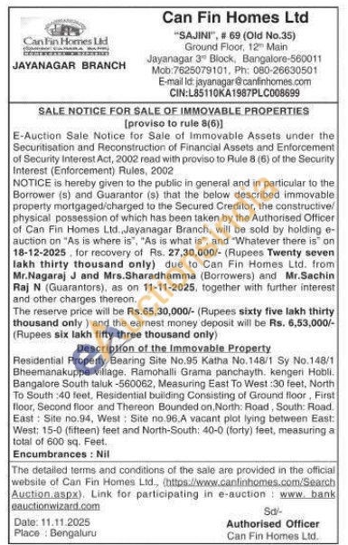 Residential Property Bearing Site No.95 Katha No.148/1 Sy No.148/1 Bheemanakuppe village. Ramohalli Grama panchayth. kengeri Hobli. Bangalore South taluk -560062, Measuring East To West:30 feet, North To South :40 feet, Residential building Consisting of Ground floor, First floor, Second floor and Thereon Bounded on, North: Road, South: Road. East: Site no.94, West: Site no.96.A vacant plot lying between East: West: 15-0 (fifteen) feet and North-South: 40-0 (forty) feet, measuring a total of 600 sq. Feet.