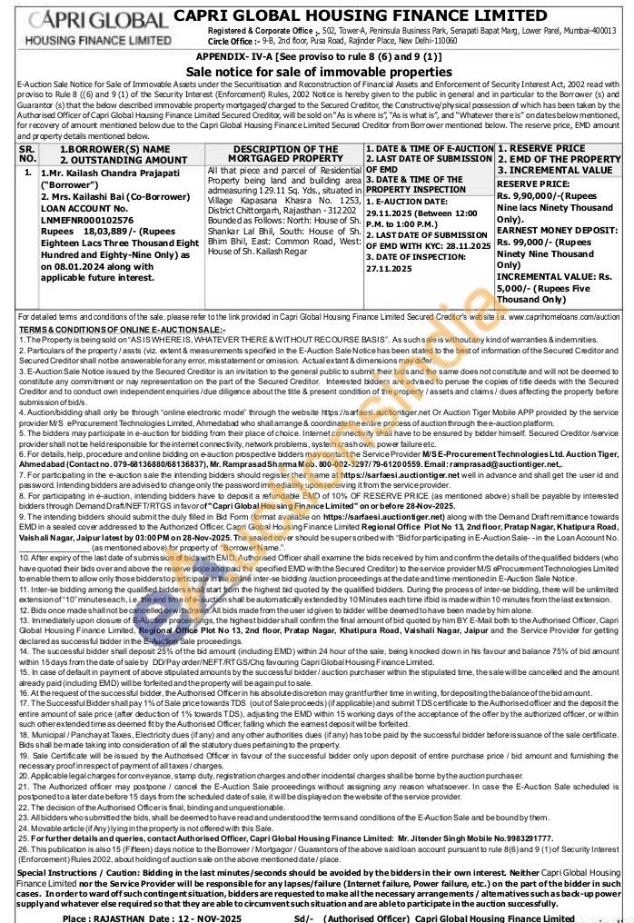 All that piece and parcel of Residential Property being land and building area admeasuring 129.11 Sq. Yds., situated in Village Kapasana Khasra No. 1253, District Chittorgarh, Rajasthan 312202 Bounded as Follows: North: House of Sh. Shankar Lal Bhil, South: House of Sh. Bhim Bhil, East: Common Road, West: House of Sh. Kailash Regar
