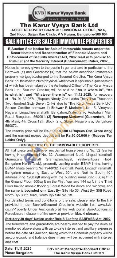 All that piece and parcel of residential house bearing No. 32 (earlier having Khaneshumari No. 32, Assessment No.9, Lingadhiranahalli Gramatana, Herohalli Gramapanchayat, Yeshwantpura Hobli, Bangalore North Taluk), presently coming under BBMP limits, having BBMP khata bearing No 194/9/32, Herohalli Ward, Lingadhiranahalli, Bangalore measuring East to West 30ft and Nort to South 40ft admeasuring 1200sqft along with the building measuring 886sq ft in the Ground Floor, 500 sq ft on the First floor and 144 sq ft in the Third Floor having mosaic flooring, Forest Wood for doors and windows and the same is bounded on, East By- Site No 33, West By-30ft Road, North By- 30 ft Road, South By- Site No. 18.