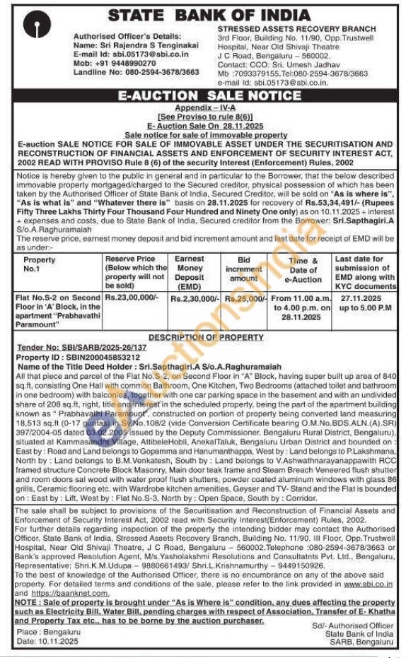 Flat No.S-2 on Second Floor in 'A' Block, in the apartment "Prabhavathi Paramount"