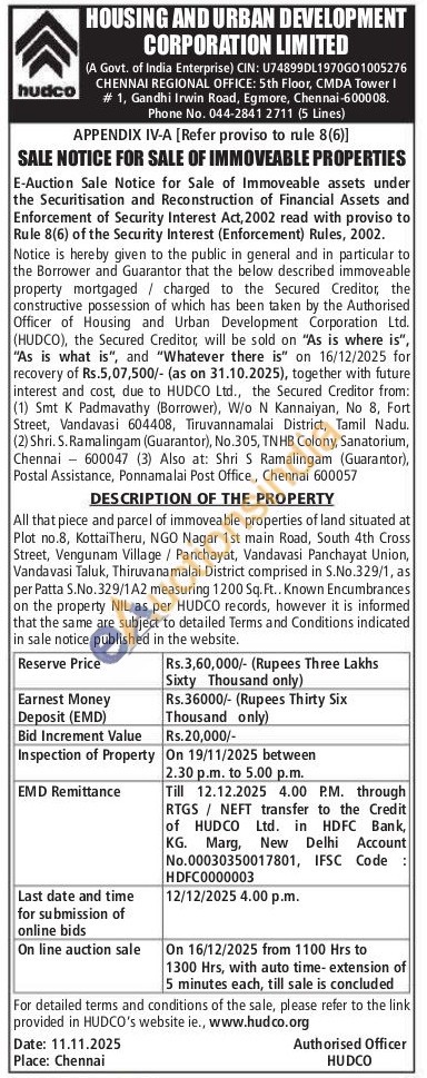 All that piece and parcel of immoveable properties of land situated at Plot no.8, Kottai Theru, NGO Nagar 1st main Road, South 4th Cross Street, Vengunam Village / Panchayat, Vandavasi Panchayat Union, Vandavasi Taluk, Thiruvanamalai District comprised in S.No.329/1, as per Patta S.No. 329/1A2 measuring 1200 Sq. Ft.. Known Encumbrances on the property NIL as per HUDCO records, however it is informed that the same are subject to detailed Terms and Conditions indicated in sale notice published in the website.