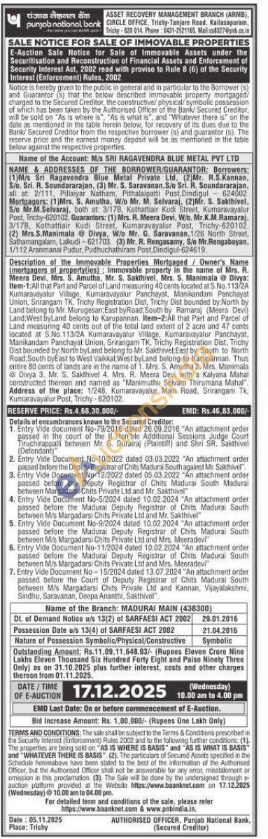 Description of the Immovable Properties Mortgaged / Owner's Name (mortgagers of property(ies): Immovable property in the name of of Mrs. R. Meera Devi, Mrs. 5. Amutha, Mr. S. Sakthivel, Mrs. S. Manimala Divya: Item-1:All that Part and Parcel of Land measuring 40 cents located at S.No 113/2A Kumaravayalur Village, Kumaravayalur Panchayat, Manikandam Panchayat Union, Srirangam TK. Trichy Registration Dist, Trichy Dist bounded by:North by Land belong to Mr. Murugesan East by Road, South by Ramaraj (Meera Devi) Land West byLand belong to Karupannan. Rem-2:All that Part and Parcel of Land measuring 40 cents out of the total land extent of 2 acre and 47 cants located at S.No 113/2A Kumaravayalur Village, dur Village, Kumaravayalur Panchayat, Manikandam Panchayat Union, Srirangam TK, Trichy Registration Dist, Trichy Dist bounded by North byLand belong to Mr. Sakthivel, East by South to North Road, South byEast to West Vakkal, West byLand belong to Karupannan. Thus entire 80 cents of lands are in the name of 1. Mrs. S. Amutha 2. Mrs. Maninmala Divya 3. Mr. S. Sakthivel 4. Mrs. R. Meera Devi with a Kalyana Mahal constructed thereon and named as "Manimuthu Selvam Thirumana Mahal Address of the place: 1/248, Kumaravayalur Main Road, Srirangam Tk Kumaravayalur Post, Trichy-620102