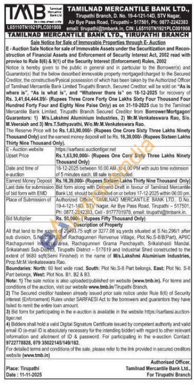 All that land to the extent of 29493.75 sqft or 3277,08 sq yards situated at S No.296/1 after sub division, S.No.296/182 of Rachagunnen Renvenue Village, Plot No.S-8/B(Part), APIC Rachagunneri Industrial area, Rachagunneri Grama Panchayath, Srikalahasti Mandal Srikalahasti Sub-District, Tirupathi District-517619 and industrial Shed constructed to the extent of 9680 sqft (Semi Finished) in the name of M/s.Lakshmi Aluminium Industries, Prop. Mr.M. Venkateswara Rao.