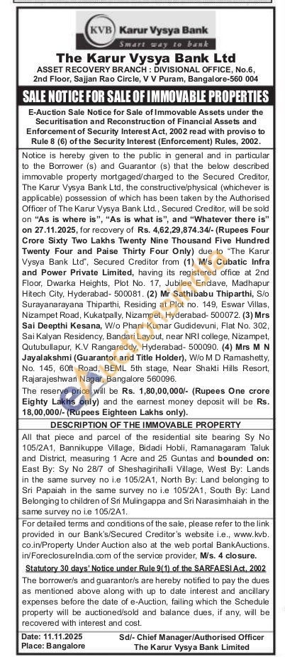 All that piece and parcel of the residential site bearing Sy No 105/2A1, Bannikuppe Village, Bidadi Hobli, Ramanagaram Taluk and District, measuring 1 Acre and 25 Guntas and bounded on: East By: Sy No 28/7 of Sheshagirihalli Village, West By: Lands in the same survey no i.e 105/2A1, North By: Land belonging to Sri Papaiah in the same survey no i.e 105/2A1, South By: Land Belonging to children of Sri Mulingappa and Sri Narasimhaiah in the same survey no ie 105/2A1.