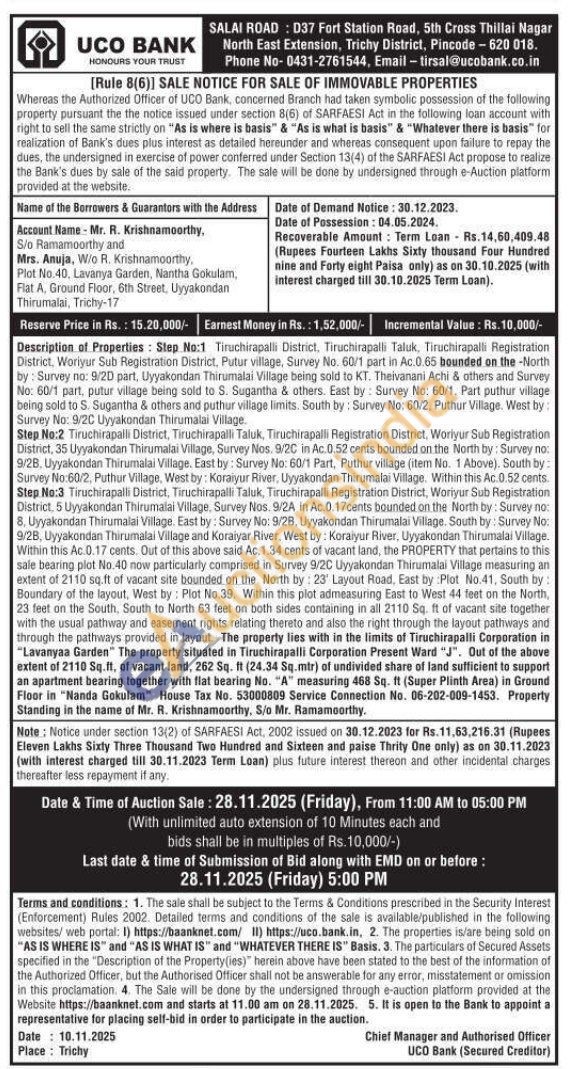 Description of Properties: Step No:1 Tiruchirapalli District, Tiruchirapalli Taluk, Tiruchirapalli Registration District. Woriyur Sub Registration District, Putur village, Survey No. 60/1 part in Ac 0.65 bounded on the North by: Survey no: 9/2D part, Uyyakondan Thirumalai Village being sold to KT. Theivanani Achi & others and Survey No: 60/1 part, putur village being sold to S. Sugantha & others. East by: Survey No: 60/1, Part puthur village being sold to S. Sugantha & others and puthur village limits. South by: Survey No: 60/2, Puthur Village. West by: Survey No: 9/2C Uyyakondan Thirumalai Village. Step No:2 Tiruchirapalli District, Tiruchirapalli Taluk, Tiruchirapalli Registration District, Woriyur Sub Registration District, 35 Uyyakondan Thirumalai Village, Survey Nos. 9/20 in Ac.0.52 cents bounded on the North by: Survey no: 9/28, Uyyakondan Thirumalai Village. East by: Survey No: 60/1 Part, Puthur village (item No. 1 Above). South by: Survey No:60/2, Puthur Village, West by: Koraiyur River, Uyyakondan Thirumalai Village. Within this Ac.0.52 cents. Step No:3 Tiruchirapalli District, Tiruchirapalli Taluk, Tiruchirapalli Registration District, Woriyur Sub Registration District, 5 Uyyakondan Thirumalai Village, Survey Nos. 9/2A in Ac.0.17cents bounded on the North by: Survey no: 8. Uyyakondan Thirumalai Village. East by: Survey No: 9/28, Uyyakondan Thirumalai Village. South by: Survey No: 9/2B, Uyyakondan Thirumalai Village and Koraiyar River, West by: Koraiyur River, Uyyakondan Thirumalai Village. Within this Ac.0.17 cants. Out of this above said Ac.1.34 cents of vacant land, the PROPERTY that pertains to this sale bearing plot No. 40 now particularly comprised in Survey 9/20 Uyyakondan Thirumalai Village measuring an extent of 2110 sq.ft of vacant site bounded on the North by: 23' Layout Road, East by :Plot No.41, South by Boundary of the layout, West by: Plot No.39. Within this plot admeasuring East to West 44 feet on the North, 23 feet on the South, South to North 63 feet on both sides containing in all 2110 Sq. ft of vacant site together with the usual pathway and easement rights relating thereto and also the right through the layout pathways and through the pathways provided in layout