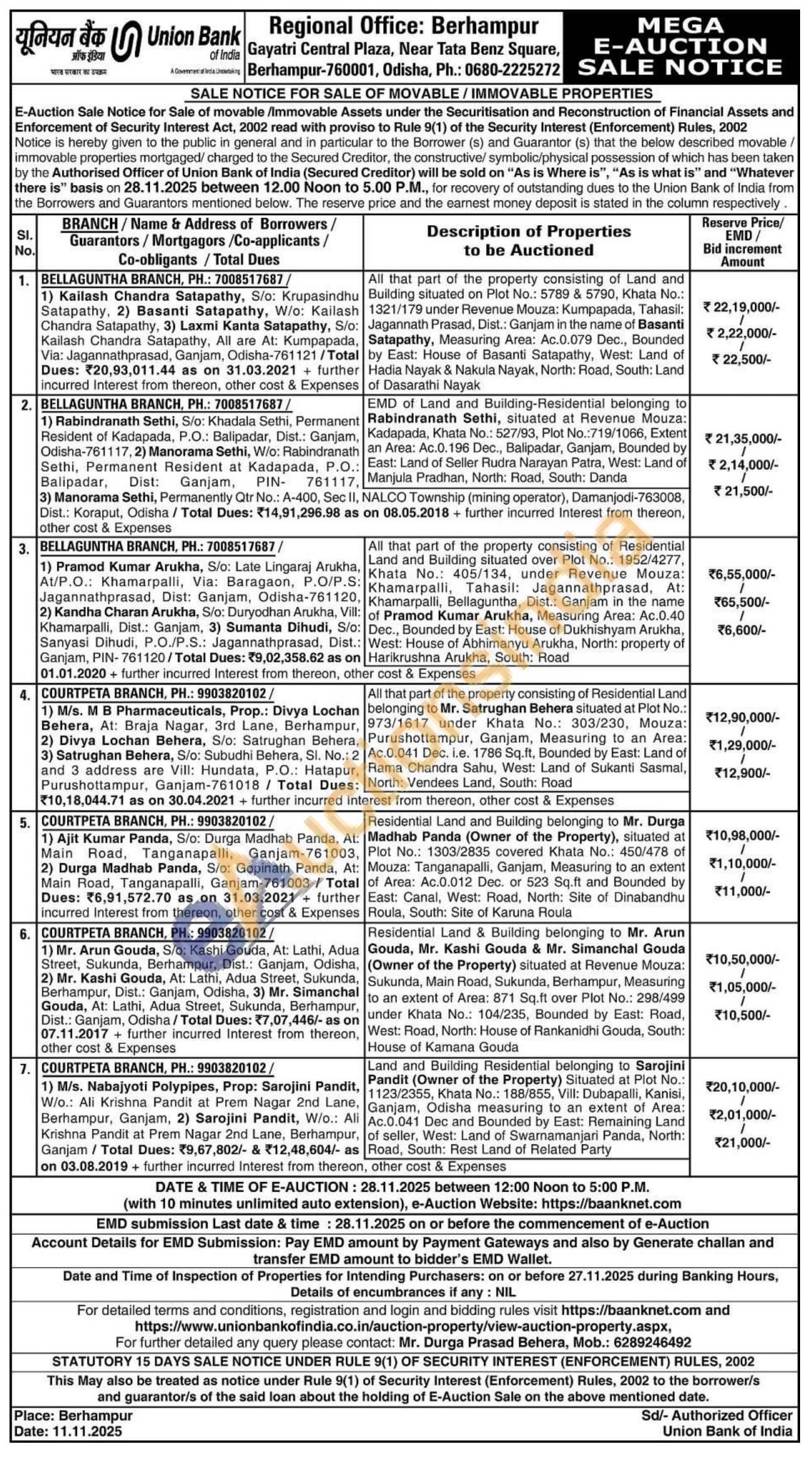 1) All that part of the property consisting of Land and 1321/179 under Revenue Mouza: Kumpapada, Tahasil: Jagannath Prasad, Dist.: Ganjam in the name of Basanti Satapathy, Measuring Area: Ac.0.079 Dec., Bounded by East: House of Basanti Satapathy, West: Land of Hadia Nayak & Nakula Nayak, North: Road, South: Land of Dasarathi Nayak