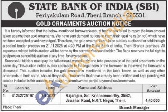 State Bank of India Gold Auctions Auction in Theni