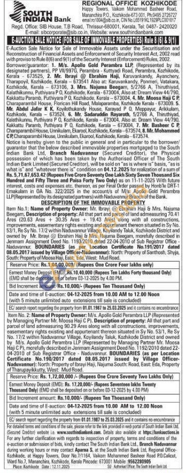 by Managing Partner Mr. Moosa Haji CP). Description of property: All that part and parcel of land admeasuring 90.29 Ares along with all constructions, improvements, easementary rights existing and appurtenant thereon situated in Sy No. 53/1, Re Sy No. 17/2 within Naduvannur Village, Koyilandy Taluk, Kozhikode District and owned by M/s. Apollo Gold Perambra LLP (Represented by Managing Partner Mr. Moosa Haji C P), morefully described in Jenmam Assignment Deed No. 1192/2010 dated 22- 04-2010 of Sub Registrar Office Naduvannur. BOUNDARIES (as per Location Certificate No.190/2017 dated 08.05.2017 issued by Village Officer-Naduvannur): North: Property of Ibrayi Haji, Najuma South: Road, East: Eda, Property of Tharupayikkutty, West: Mud Road