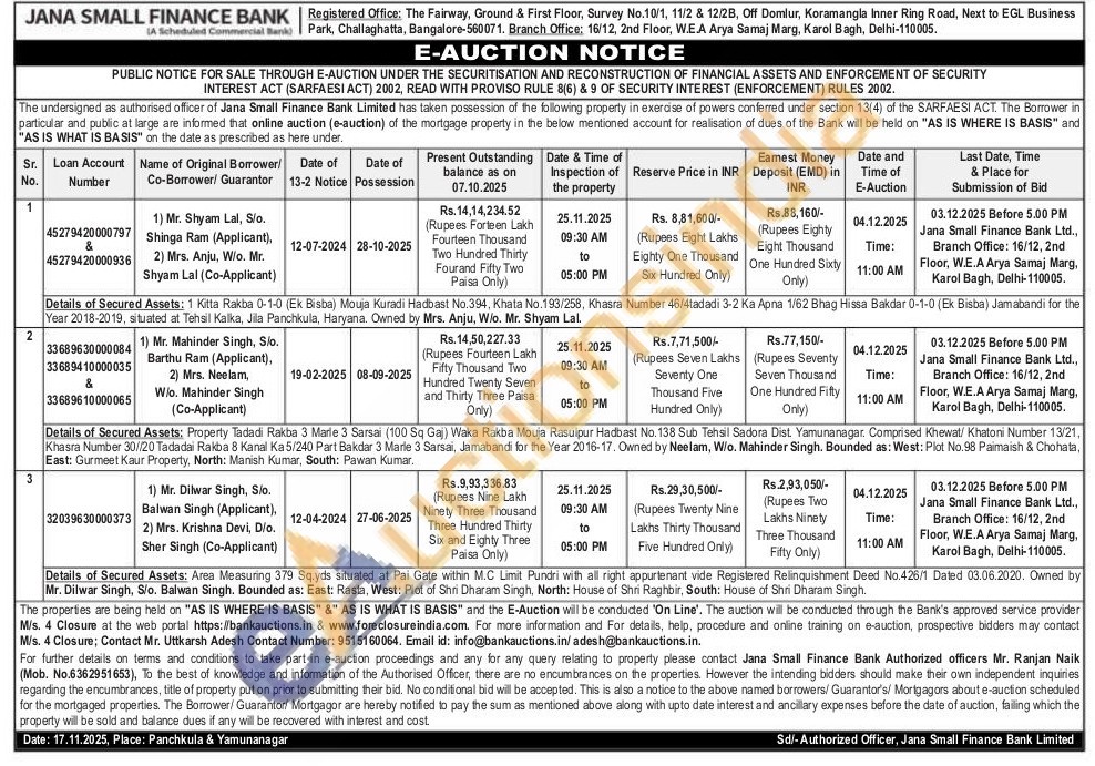 Details of Secured Assets: Area Measuring 379 Sq.yds situated at Pai Gate within M.C Limit Pundri with all right appurtenant vide Registered Relinquishment Deed No.426/1 Dated 03.06.2020. Owned by Mr. Dilwar Singh, S/o. Balwan Singh. Bounded as: East: Rasta, West: Plot of Shri Dharam Singh, North: House of Shri Raghbir, South: House of Shri Dharam Singh.