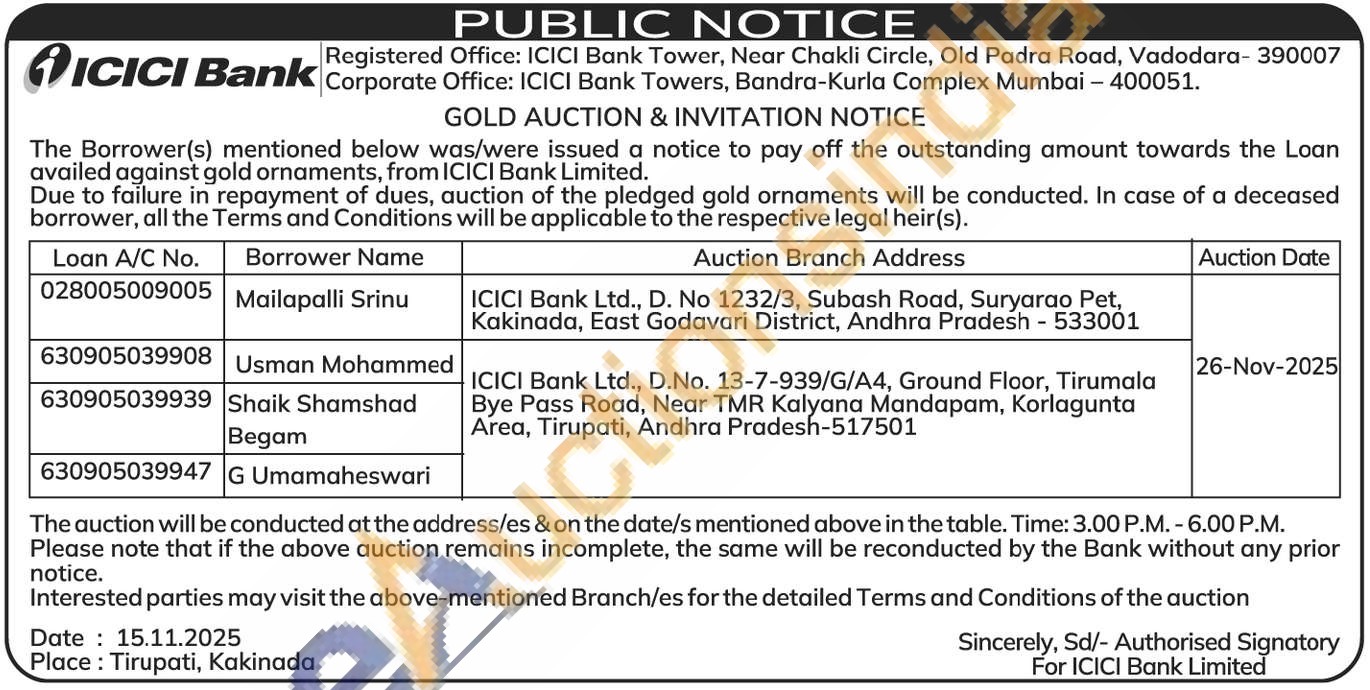 ICICI Bank Gold Auctions Auction in Thirupathi