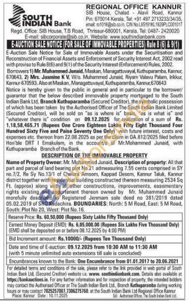 Mr. Muhammed Junaid, Description of property: All that part and parcel of land bearing plot No.21 admeasuring 7.55 cents comprised in SY no.7/2, Re Sy No.13/1 of Chelora Amsom, Kappad Desom, Kannur Taluk, Kannur district together with residential building constructed thereon measuring 2534 Sq Ft. (approx) along with all other constructions, improvements, easementary rights existing and appurtenant thereon owned by Mr. Muhammed Junaid marefully described in Registered Jenmam sale deed no 381/2019 dated 05.02.2019 of SRO Kadachira. BOUNDARIES: North: 5 M Road, East: 5 M Road, South: Plot No 20, West: Plot No.16.