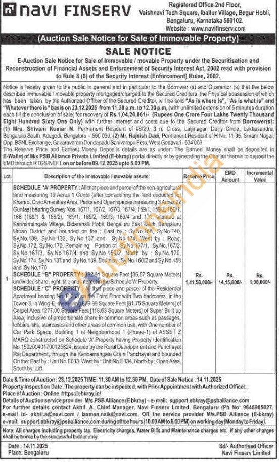 SCHEDULE "C" PROPERTY: All that piece and parcel of the Residential Apartment bearing No. E 033 on the Third Floor with Two bedrooms, in the Tower-3, in Wing-E, measuring 879.99 Square Feet (81.75 Square Meters) of Carpet Area, 1277.00 Square Feet [118.63 Square Meters] of Super Built up Area, inclusive of proportionate share in common areas such as passages, lobbies, lifts, staircases and other areas of common use, with One number of Car Park Space, Building 1 of Neighborhood 1 (Phase-1) of ASSET Z MARQ constructed on Schedule 'A' Property having Property Identification No. 150200401700125824, issued by the Rural Development and Panchayat Raj Department, through the Kannamangala Gram Panchayat and bounded On the: East by: Unit No.F033, West by: Unit No. E034, North by: Open Area, South by: Lift