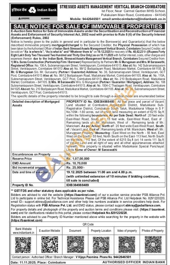PROPERTY ID No. IDIB384988489: All that piece and parcel of Vacant Land situated at Coimbatore Registration District, Madukkarai Sub-Registration District, Coimbatore South Taluk, Madukkarai Village in S F No. 1094-1.60 acres, out of which land measuring an extent of 6215 Sq.ft within the following boundaries: As per Sale Deed: North of: 20 feet wide East-West Road, South of 15 feet wide, East-West Road, East of: Remaining lands of Mr. Manickam, West of Remaining lands of Mr. Manickam. As per Actual: North of: 20 feet wide East-West Road, South of: Vacant Land, East of: Remaining lands of Mr. Manickam, West of: Mr. Murugesan Property. Measuring: East West on the North 55 feet, East West on the South-55 feet, North South on the East- 113 feet, North South on the West 113 feet, Of the extent of 6215 Sq.ft (or) 14 cents 111 Sq.ft of Vacant Land and all right of way and all other appurtenances attached herewith. This property is situated within Madukkarai Special Panchayat Limits Name of Owner: M Saraswathi