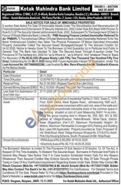 All that piece and parcel of residential Flat No. C-1003, Tower-C, 10TH Floor, Krish Vatika, Alwar Bypass Road, admeasuring 1665 sq ft including carpet area comprised within said unit, area of the walls and columns and proportionate indivisible share in the common space in the building situated on plot of Land Measuring 26451.14 sq.mirs being the group housing land in Khasra No. 559, 500, 561 & 562 located at Village-Khanpur, Halka-Bhiwadi, Tehsil-Tijara, District-Alwar (Rajasthan) (Far-1.67. Maximum Permissible Heght 30 Meters, Maximum Permissible Coverage-35%, Parking and Building Bye-Laws Will Applicable) Property bounded as: East: Proposed 18 mtr. Wide Road, West: Vilage Khanpur (Khasra No. 573&574), Norit Pink City Housing Scheme, South. Proposed 24 Mtr. Wide Road