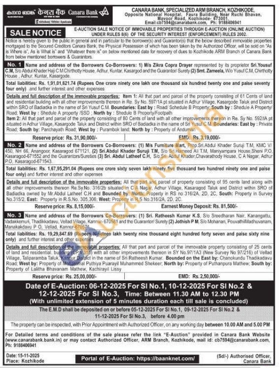 contact Authorized Officer, ARM Branch, Kozhikode, Ph: 9188406941