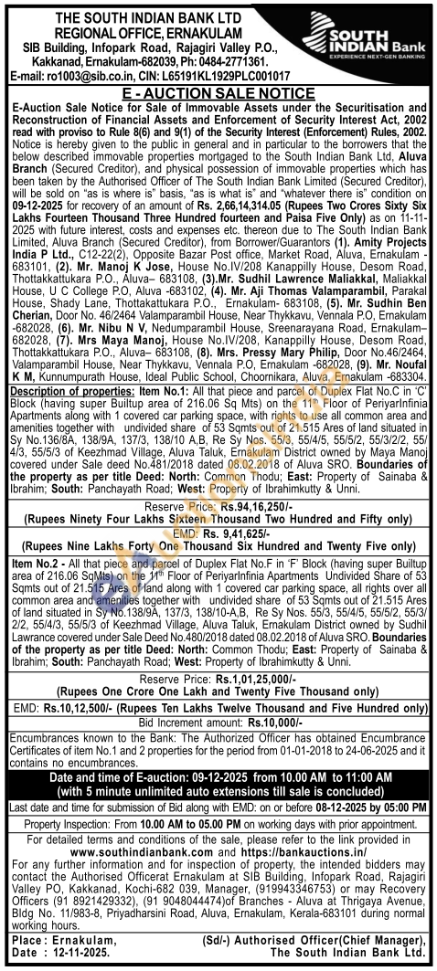Item No.1: All that piece and parcel of Duplex Flat No.C in 'C' Block (having super Builtup area of 216.06 Sq Mts) on the 11th Floor of PeriyarInfinia Apartments along with 1 covered car parking space, with rights to use all common area and amenities together with undivided share of 53 Sqmts out of 21.515 Ares of land situated in Sy No. 136/8A, 138/9A, 137/3, 138/10 A,B, Re Sy Nos. 55/3, 55/4/5, 55/5/2, 55/3/2/2, 55/4/3, 55/5/3 of Keezhmad Village, Aluva Taluk, Ernakulam District owned by Maya Manoj covered under Sale deed No.481/2018 dated 08.02.2018 of Aluva SRO. Boundaries of the property as per title Deed: North: Common Thodu: East: Property of Sainaba & Ibrahim; South: Panchayath Road; West: Property of Ibrahimkutty & Unni