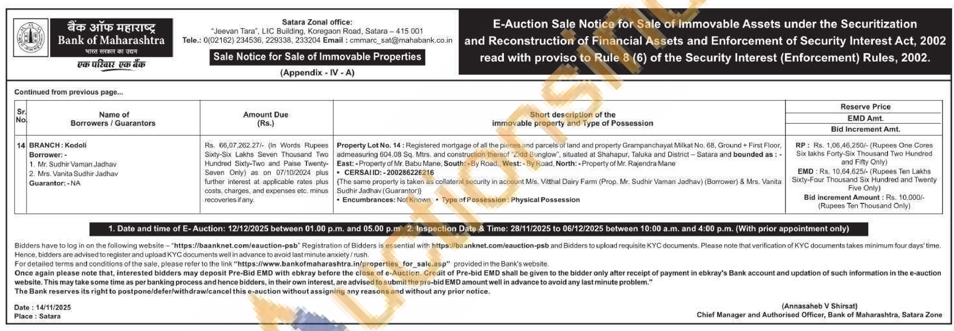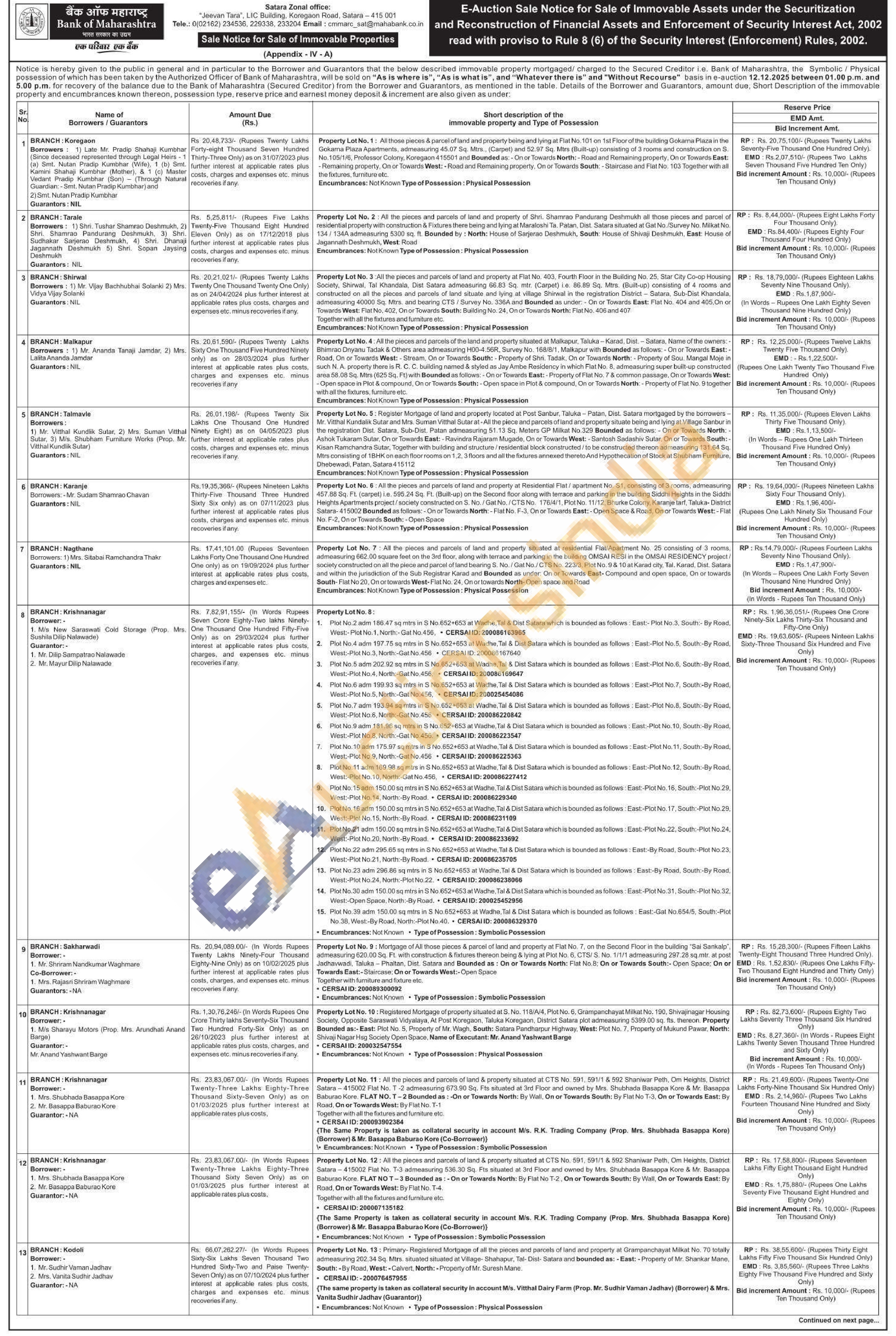 Property Lot No. 10: Registered Mortgage of property situated at S. No. 118/4/4, Plot No. 6, Grampanchayat Milkat No. 100, Shivajinagar Housing Society, Opposite Saraswati Vidyalaya, At Post Koregaon, Taluka Koregaon, District Satara plot admeasuring 5399.00 sq. fts, thereon. Property Bounded as:-East: Plot No. 5. Property of Mr. Wagh, South: Satara Pandharpur Highway, West: Plot No. 7. Property of Mukkond Pawar, North: Shivaji Nagar Hag Society Open Space, Name of Executant: Mr. Anand Yashwant BargeCERSAJID: 200032547554 Encumbrances: Not Known Type of Possession: Physical Possession