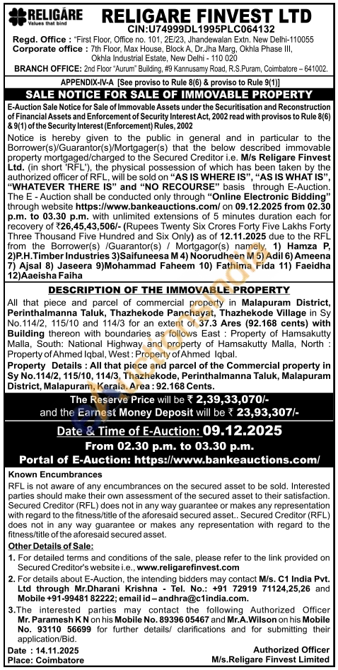 All that piece and parcel of commercial property in Malapuram District, Perinthalmanna Taluk, Thazhekode Panchayat, Thazhekode Village in Sy No.114/2, 115/10 and 114/3 for an extent of 37.3 Ares (92.168 cents) with Building thereon with boundaries as follows East: Property of Hamsakutty Malla, South: National Highway and property of Hamsakutty Malla, North: Property of Ahmed Iqbal, West: Property of Ahmed Iqbal. Property Details: All that piece and parcel of the Commercial property in Sy No.114/2, 115/10, 114/3, Thazhekode, Perinthalmanna Taluk, Malapuram District, Malapuram, Kerala. Area: 92.168 Cents.