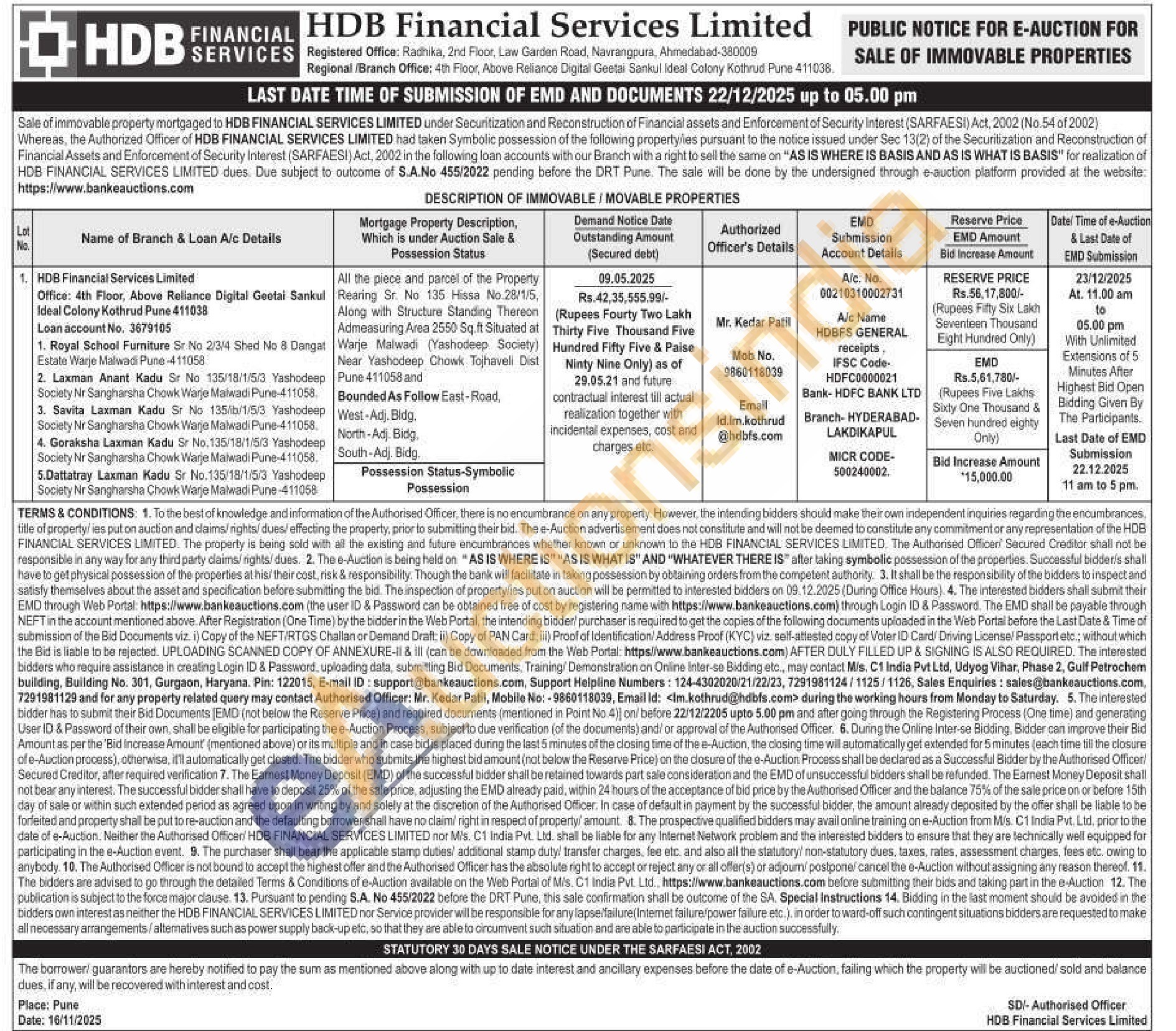 All the piece and parcel of the Property Rearing Sr. No 135 Hissa No 28/1/5, Along with Structure Standing Thereon Admeasuring Area 2550 Sq.ft Situated at Warje Malwadi (Yashodeep Society) Near Yashodeep Chowk Tojhaveli Dist Pune 411058 and Bounded As Follow East-Road, West-Adj. Bldg. North-Adj. Bidg, South-Adj. Bidg.