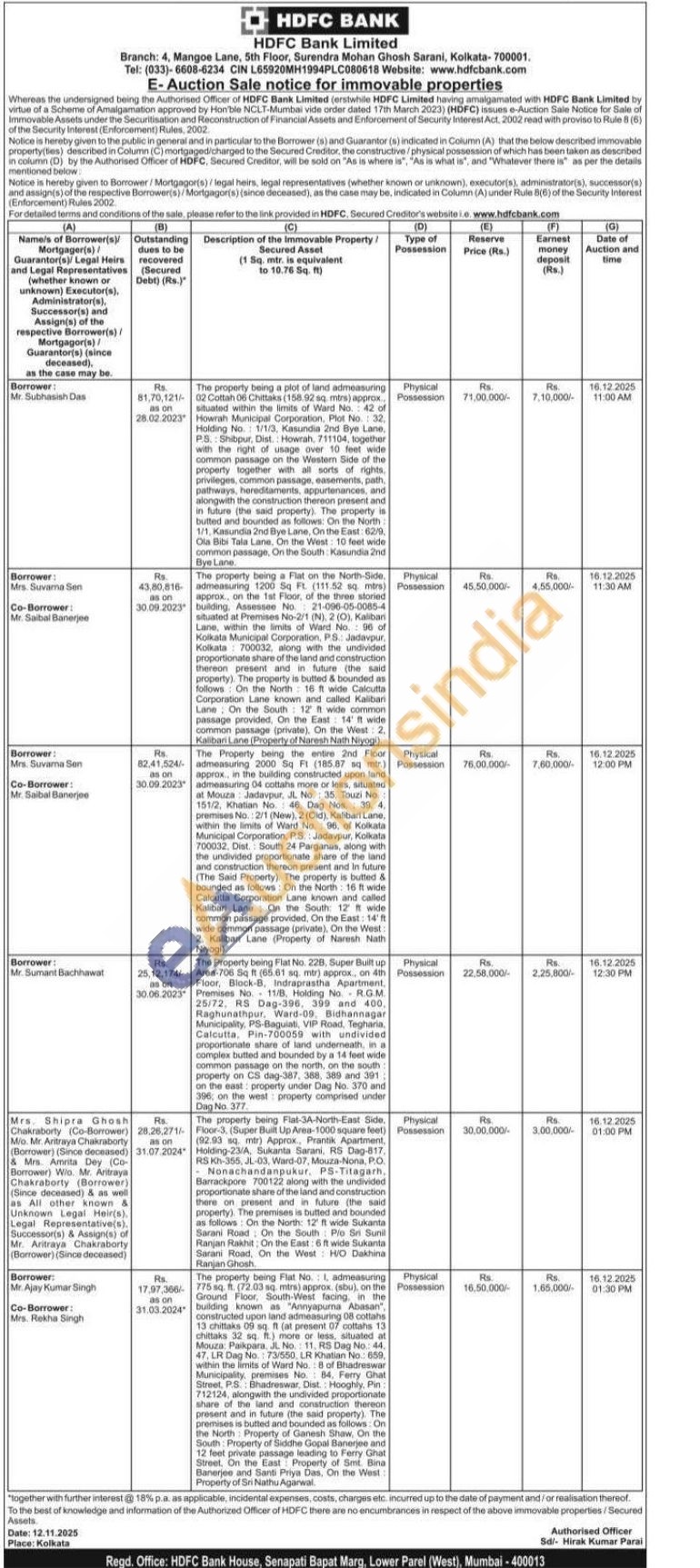 The property being a Flat on the North-Side. admeasuring 1200 Sq Ft. (111.52 sq mers) approx, on the 1st Floor, of the three storied building. Assessee No. 21-096-05-0085-4 situated at Premises No-2/1 (N), 2 (0), Kalibari Lane, within the limits of Ward No. 96 of Kolkata Municipal Corporation, PS: Jadavpur Kolkata 700032, along with the undivided proportionate share of the land and construction thereon present and in future (the said property). The property is butted & bounded as follows: On the North 16 ft wide Calcutta Corporation Lane known and called Kalibari Lane On the South 12t wide common passage provided, On the East 14' wide common passage (private), On the West 2. Kaliban Lane (Property of Naresh Nath Niyogi