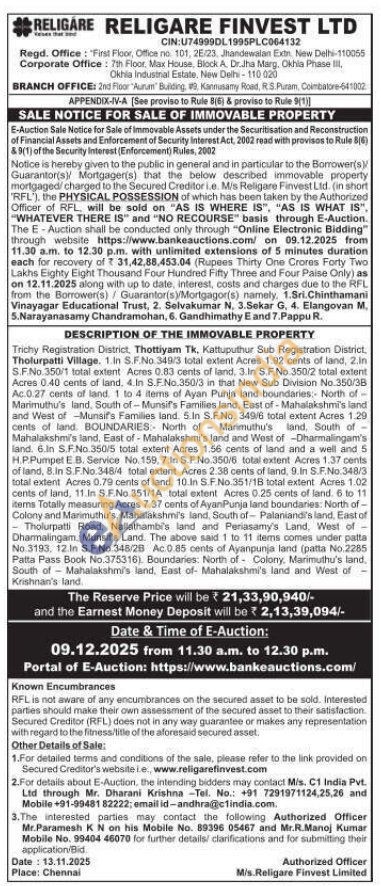 Trichy Registration District, Thottiyam Tk, Kattuputhur Sub Registration District, Tholurpatti Village. 1.In S.F.No. 349/3 total extent Acres 1.92 cents of land, 2.In S.F.No.350/1 total extent Acres 0.83 cents of land. 3.In S.F.No.350/2 total extent Acres 0.40 cents of land, 4.In S.F.No.350/3 in that New Sub Division No.350/38 Ac.0.27 cents of land. 1 to 4 items of Ayan Punja land boundaries: North of Marimuthu's land, South of Munsif's Families land, East of-Mahalakshmi's land and West of Munsif's Families land. 5. In S.F.No. 349/6 total extent Acres 1.29 cents of land BOUNDARIES: North of Manmuthu's land, South of Mahalakshmi's land. East of-Mahalakshmi's land and West of -Dharmalingam's land. 6. in S.F.No. 350/5 total extent Acres 1.56 cents of land and a well and 5 H.P.Pumpet E.B. Service No. 159, 7.In S.F.No.350/6 total extent Acres 1.37 cents of land, 8. in S.F.No.348/4 total extent Acres 2.38 cents of land, 9.In S.F.No. 348/3 total extent Acres 0.79 cents of land, 10. In S.F.No.351/18 total extent Acres 1.02 cents of land, 11.In S.F.No. 351/1A total extent Acres 0.25 cents of land. 6 to 11 iterns Totally measuring Acres 7.37 cents of AyanPunja land boundaries: North of-Colony and Marimuthu's, Mahalakshmi's land, South of Palaniand's land, East of