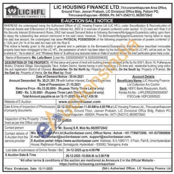 DESCRIPTION OF THE PROPERTY; All that piece and parcel of land with building thereon situated at Re Sy No 505/1, Block 19, Puthenpura Mukku, Chavara Village, Karunagapally Taluk, Kollam District, Kerala having in plot measuring 2.24 Ares and residential building lying within the sub registration District of Chavara Boundaries: On the North by: Property of Indulekha, On the South by: Property of Pramod, On the East by: Property of Hema, On the West by: Road