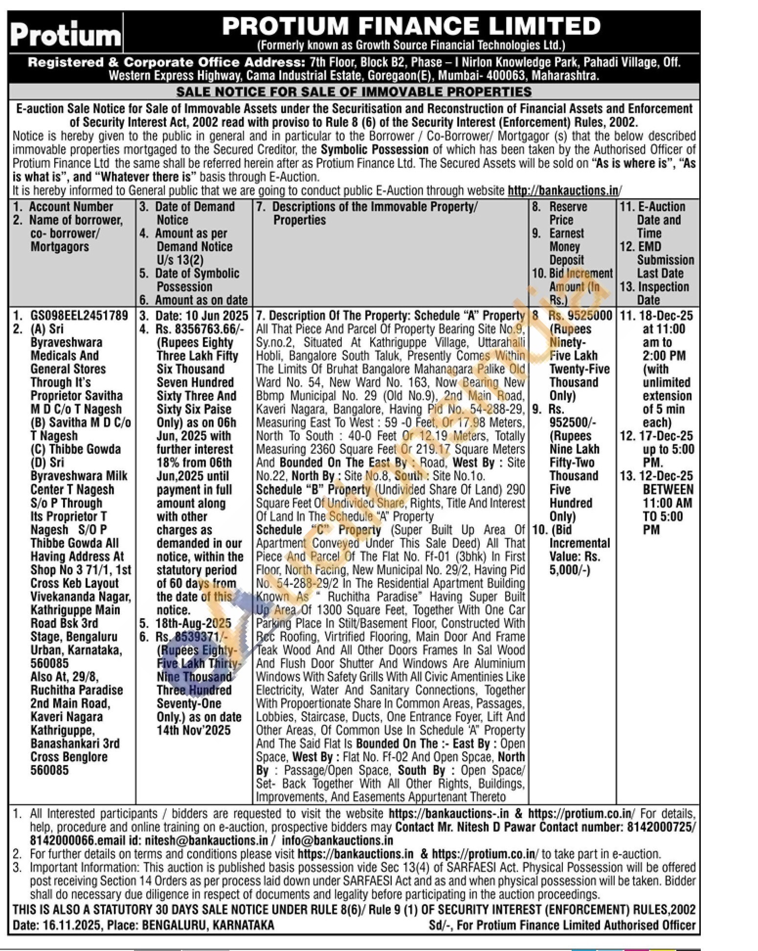 Description Of The Property: Schedule "A" Property All That Piece And Parcel Of Property Bearing Site No.9. Sy.no.2, Situated At Kathriguppe Village, Uttarahalli Hobli, Bangalore South Taluk, Presently Comes Within The Limits Of Bruhat Bangalore Mahanagara Palike Old Ward No. 54, New Ward No. 163, Now Bearing New Bbmp Municipal No. 29 (Old No.9), 2nd Main Road, Kaveri Nagara, Bangalore, Having Pid No. 54-288-29, 9. Rs. Measuring East To West: 59-0 Feet, Or 17.98 Meters, North To South 40-0 Feet Or 12.19 Meters, Totally Measuring 2360 Square Feet Or 219.17 Square Meters And Bounded On The East By Road, West By: Site No.22, North By: Site No.8, South: Site No.10. Schedule "B" Property (Undivided Share Of Land) 290 Square Feet Of Undivided Share, Rights, Title And Interest Of Land In The Schedule "A" Property