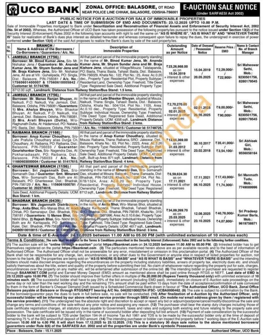 All that part and parcel of the immovable property S/o-standing in the name of Minurani Das, W/o- Somanath Das, situated at Mouza: Balasahi, Thana: Bansada, Dist: Bhadrak, PIN-756129, Khata No.: 236/134, Plot No.: 678/1524, Area: Ac.0.20 dec. Property Type: Residential, Property Subtype: Individual House, Ownership Type: Freehold, Title Deed Type: Registered 8712 sqft., Landmark: Distance from Railway Station