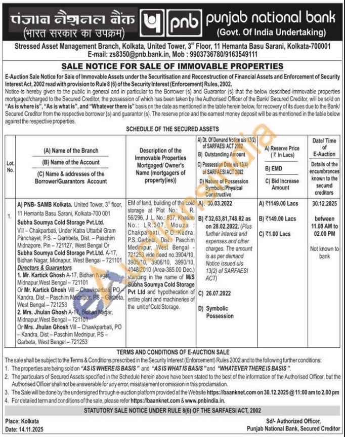 EM of land, building of the cold storage at Plot No.: L. R. 56/296, J.L. No.: 837, Khatian B) No.: LR.307, Mouza Chakparbati, P.O.:Kedra, P.S. Garbeta, Dist.: Paschim Medinipur, West Bengal 721253 vide deed no.3904/10, 3905/10, 3906/10, 3990/10, 4048/2010 (Area-385.00 Dec.) standing in the name of M/S Subha Soumya Cold Storage Pvt Ltd and hypothecation of entire plant and machineries of the unit of Cold Storage