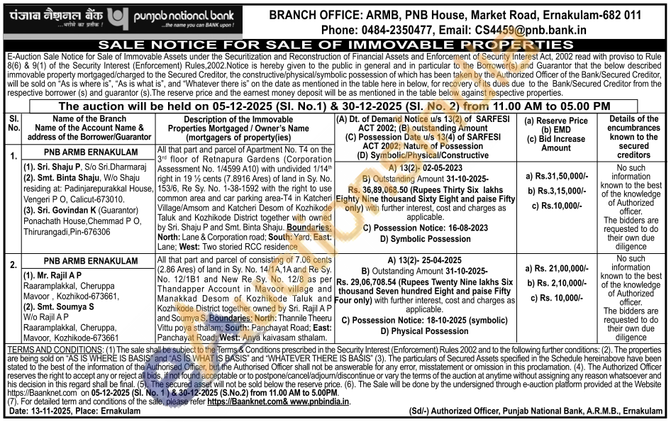 Contact Phone: 0484-2350477, Email: CS4459@pnb.bank.in