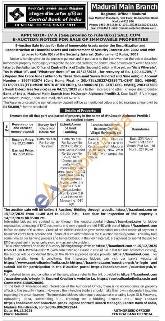 Immovable: All that part and parcel of property in the name of Mr.Joseph Alphonse Predith J as detailed below:Patta No. 130. Re-Survey No.22/4cMadurai Dist, Madurai South, Arasaradi Registration off, Madurai South Taluk, Now West Taluk, Achampathu Village