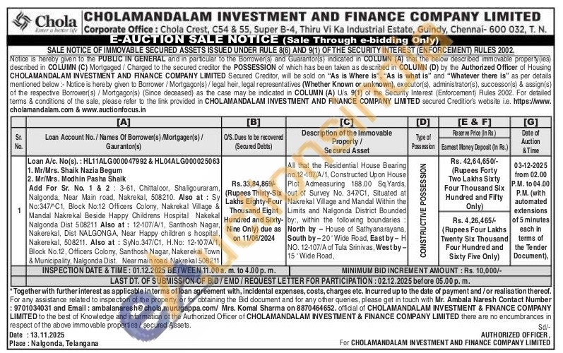 Contact Mr. Ambala Naresh Contact Number : 9701034031 and Email: ambalanaresh@chola.murugappa.com/ Mrs. Komal Sharma on 8870464652