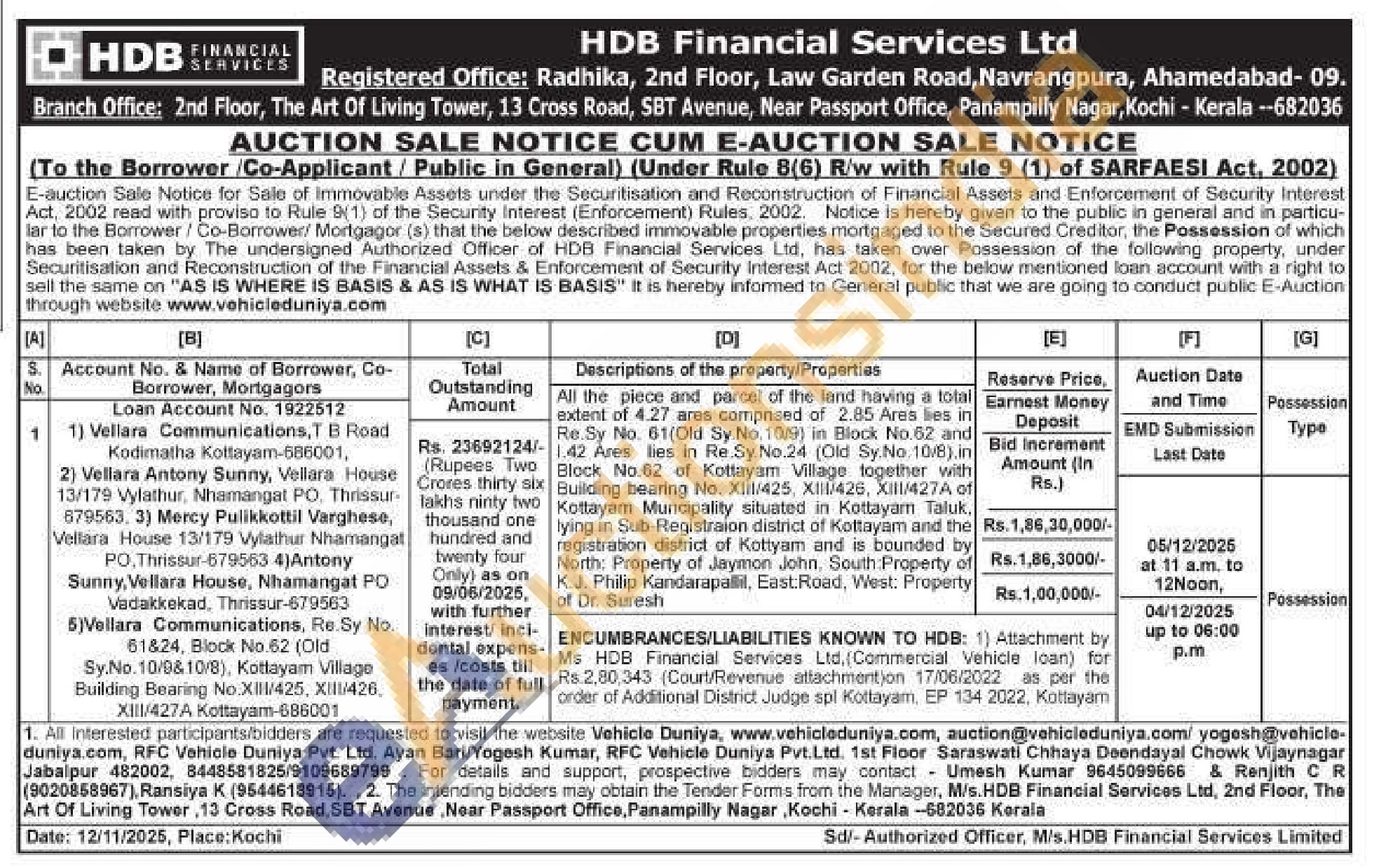 All the piece and parcel of the land having a total extent of 4.27 ares comprised of 2.85 Ares lies in Re.Sy No. 61(Old Sy.No. 10/9) in Block No.62 and -42 Ares lies in Re.Sy. No.24 (Old Sy.No. 10/8) in Block No.62 of Kottayam Village together with Building bearing No. Xiil/425, XIII/426, Xil/427A of Kottayam Muncipality situated in Kottayam Taluk. lying in Sub-Registraion district of Kottayam and the registration district of Kottyam and is bounded by North: Property of Jaymon John, South Property of K.J. Philip Kandarapallil, East Road, West: Property of Dr. Suresh