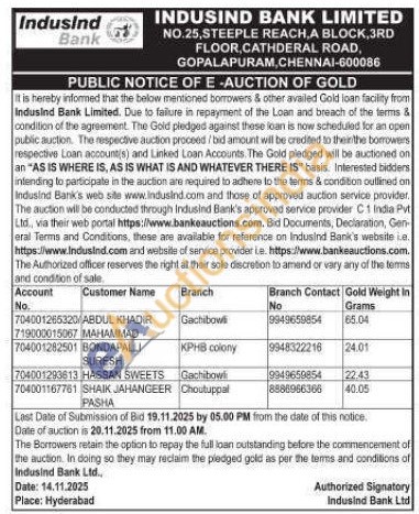 IndusInd Bank Gold Auctions Auction in Hyderabad