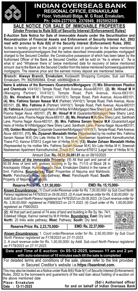 Property: (1) All that part and parcel of 50.59 Ares of land with godown building in Sy No. 71/1/3 of Block 28 in Arackapady Village, Kunnathunadu Taluk, Ernakulam District in the name of Smt. Fathima. Boundaries: East: Properties of Nejuma and Mahboob; North: Panchayath Road and pathway; West: Panchayath Road; South: Property of Nejuma Mahaboob.