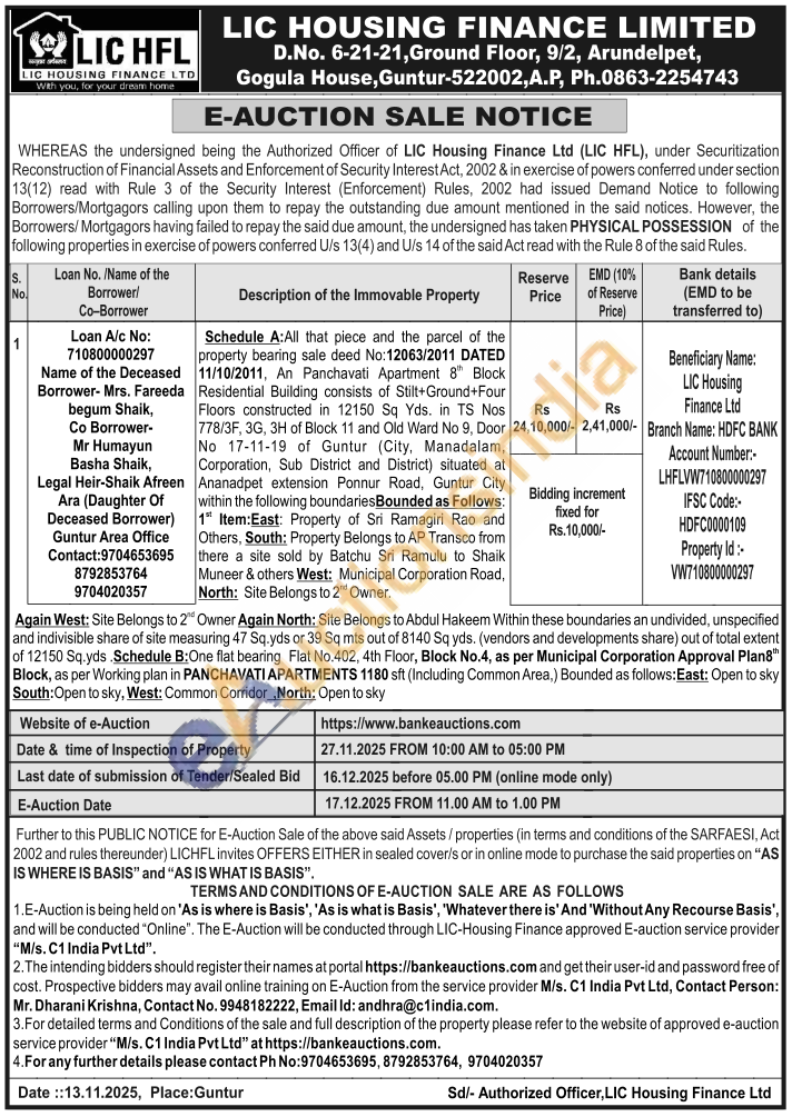Schedule A:All that piece and the parcel of the property bearing sale deed No:12063/2011 DATED 11/10/2011, An Panchavati Apartment 8" Block Residential Building consists of Stilt+Ground+Four Floors constructed in 12150 Sq Yds. in TS Nos 778/3F, 3G, 3H of Block 11 and Old Ward No 9, Door No 17-11-19 of Guntur (City, Manadalam, Corporation, Sub District and District) situated at Ananadpet extension Ponnur Road, Guntur City within the following boundaries Bounded as Follows: 1 Item:East: Property of Sri Ramagiri Rao and Others, South: Property Belongs to AP Transco from there a site sold by Batchu Sri Ramulu to Shaik Muneer & others West: Municipal Corporation Road, North: Site Belongs to 2 Owner. Again West: Site Belongs to 2 Owner Again North: Site Belongs to Abdul Hakeem Within these boundaries an undivided, unspecified and indivisible share of site measuring 47 Sq.yds or 39 Sq mts out of 8140 Sq yds. (vendors and developments share) out of total extent of 12150 Sq.yds. Schedule B:One flat bearing Flat No.402, 4th Floor, Block No.4, as per Municipal Corporation Approval Plan8th Block, as per Working plan in PANCHAVATI APARTMENTS 1180 sft (Including Common Area,) Bounded as follows: East: Open to sky South: Open to sky, West: Common Corridor, North: Open to sky