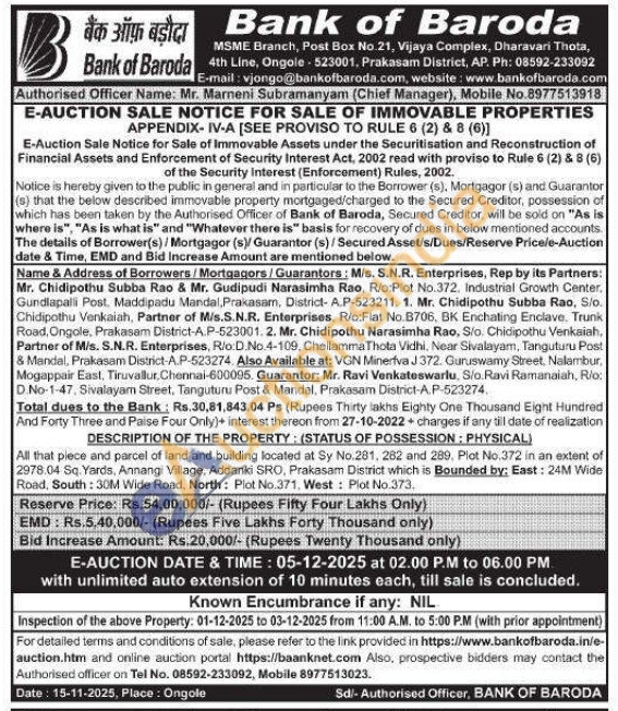 All that piece and parcel of land and building located at Sy No.281, 282 and 289, Plat No.372 in an extent of 2978.04 Sq. Yards, Annangi Village, Addanki SRO, Prakasam District which is Bounded by: East: 24M Wide Road, South: 30M Wide Road, North: Plot No.371. West: Plot No.373.