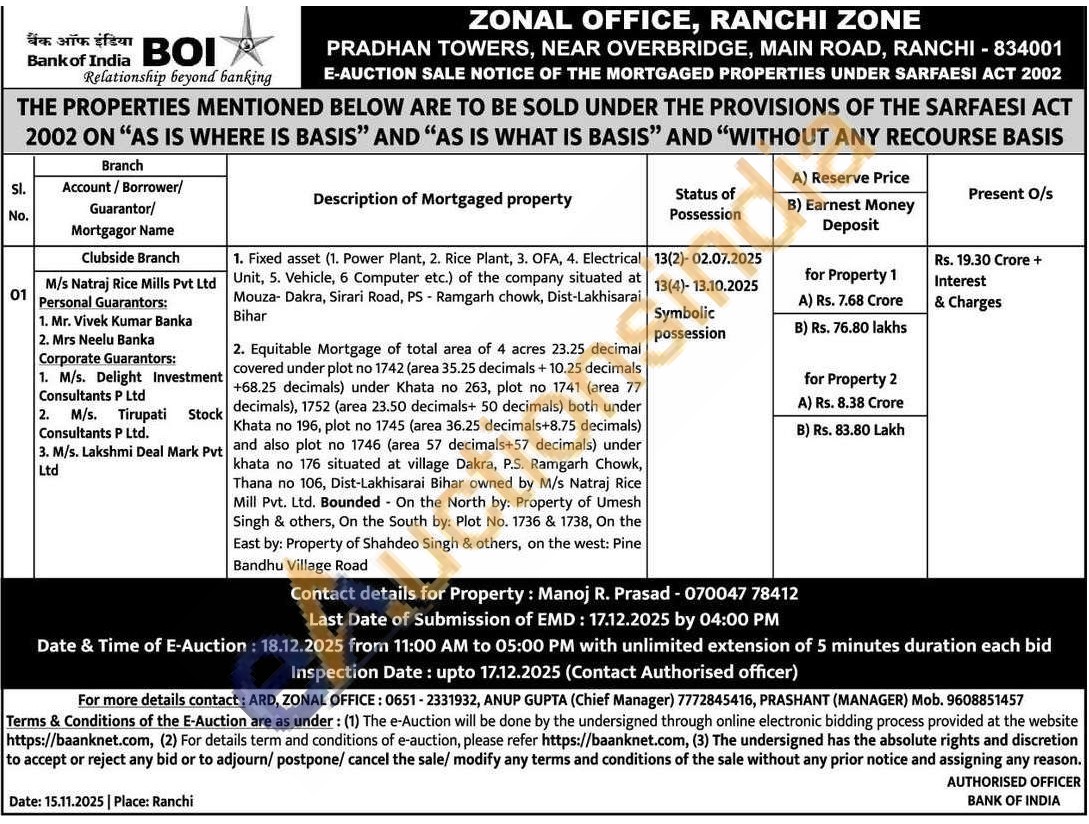Contact: ARD, ZONAL OFFICE: 0651-2331932, ANUP GUPTA (Chief Manager) 7772845416, PRASHANT (MANAGER) Mob. 9608851457