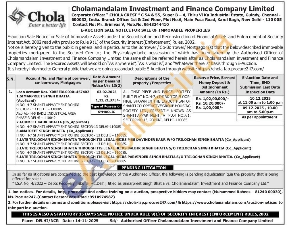 ALL THAT PIECE AND PARCEL SOCIETY BUILT FLAT NO.H-7, (THIRD TOP FLOOR-HIG), SHOWN IN THE LAYOUT PLAN OF SHANTI CO-OPERATIVE GROUP HOUSING SOCIETY LTD., PRESENTLY KNOWN AS SHANTI APPARTMENT', AT PLOT NO.7/1, SECTOR NO.13, ROHINI, DELHI-110085