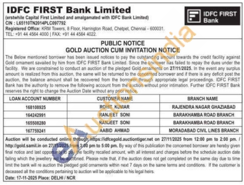 IDFC First Bank Ltd Gold Auctions Auction in Ghaziabad