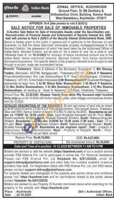 Al part and parcel of land with an extant of 39.00 cents of land in T.S.No 6/3 of Thiruvangad Ammsom, Thiruvangad Desom, Thalassery Taluk and SRO, Kannur District of land in R.S.NO 72 (old Sy No.693) Boundaries as per doc no 1156/97 for 19.50 cents: East: Ippol Ningalude Kaivasam Ulla B1 Plot: West: Roadinuvendiuilla Sthalam, North: Mustafa Kaivasan Sthalam; South: Nabeesummayude Sthalam Boundaries as per doc 2126/96 for 19.50 cents (7.89 ares): East: TS no 6/3 part: West: Musthafa kaaivasam sthalam, North: Nabeesummayude sthalam: South: Mustafa Kaivasan Sthalam Boundaries as per engineer report: East: property of khairunnisa, South: Vazhisthalam, West: Property of Mustafa, North River (Prior Encumbrance Nil as per Bank record)