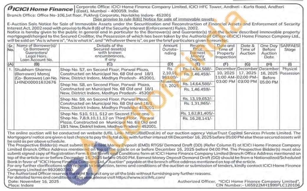 Shop No. SB, on Second Floor, Porwal Plaza, Constructed on Municipal No. 68 Old and 18/1 New, District Indore, Madhya Pradesh-452001