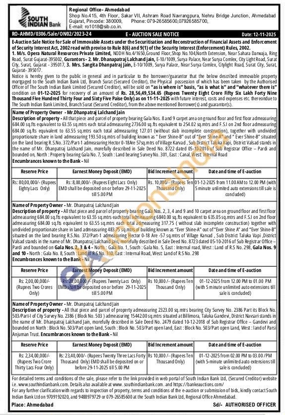 - Mr.Dhanpatraj Lalchand Jain Description of property-All that piece and parcel of property bearing Gala Nos. 8 and 9 carpet area on ground floor and first floor admeasuring 684.00 sq.fts equivalent to 63.55 sq.mtrs each total admeasuring 2736.00 sq.fts equivalent to 254.02 sq.mtrs and F.S.1 on 2nd floor admeasuring 684.00 sq.fts equivalent to 63.55 sq.mtrs each total admeasuring 127.01 (without slab incomplete construction), together with undivided proportionate share in land admeasuring 193.50 sq.mtrs of building known as Ever Shine-B" out of "Ever Shine-A" and Ever Shine-B" situated on the land bearing R.S.No. 372/Part-1 admeasuring Hector 0-18Are 57sq.mtrs of Village Karvad, Sub District Taluka Vapi, District Valsad stands in the name of Mr. Dhanpatraj Lalchand jain, morefully described in Sale Deed No. 8722 dated 05-10-2016 of Sub Registrar Office Pardi and bounded on, North: Property bearing Gala No. 7, South: Land bearing Survey No. 301, East: Canal, West Internal Road