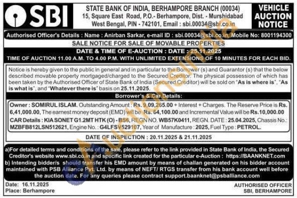 CAR Details: KIA SONET G1.2MT HTK (O)-BS6, REGN NO. WB57K0411, REGN. DATE: 25.04.2025, Chassis No.. MZBFB812LSN512621, Engine No.: G4LFSV529107, Year of Manufacture: 2025, Fuel Type: PETROL.