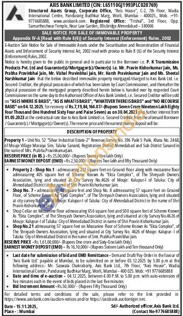 Shop No. 7-admeasuring 48 square feet and Shop No. 8 admeasuring 57 square feet on Ground Floor, of Scheme Known As "Ekta Complex", of The Shreyash Owners Association, lying and situated at city survey No.4626 of Mouje: Kalupur- of Taluka: City of Ahmedabad District in the name of Shri Pravin Kishorkumar Jain. Shop Cellar on Mezzanine floor admeasuring 656 square feet and 500 square feet of Scheme Known As "Ekta Complex", of The Shreyash Owners Association, lying and situated at city Survey No.4626 of Mouje: Kalupur-I of Talluka: City of Ahmedabad District in name of Shri Pravin Kishorkumar Jain.