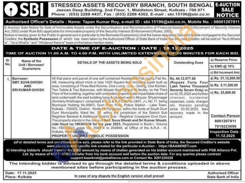 All that piece and parcel of one self contairsed Residential Flat, being Flat No. AB, measuring about more or less 1420 Square feet including super built up area, consisting of Three Bed Rooms, One Living-cum-Dining, One Kitchen, Two Toilets & Two Balconies, with Mosaic flooring and lift facility, on the Third Floor of the building, together with undivided proportionate impartiable share of land underneath the said building lying & situated within Mouza- Shyamnagar (formerly Krishnapur), comprised in C.S & R.S Dag No.2467, J.L No.17, being Municipal Holding No.699/3, Dum Dum Park, Police Station Lake Town, Kolkata-700055, District-North 24 Parganas, within the limits of South Dum Dum Municipality Ward No. 28, within the jurisdiction of the District Sub Registrar Barasat & Additional District Sub-Registrar Cossipore Dum Dum. The property stands in the name of Smt. Suva Ghosh and Sri Kumar Ghosh, vide Deed no.190305436 for the year 2023, Registered in Book-1, Volume No.-1903-2023, page No. 204814 to 204846, at Office of the A.R.A III, Kolkata, West Bengal.