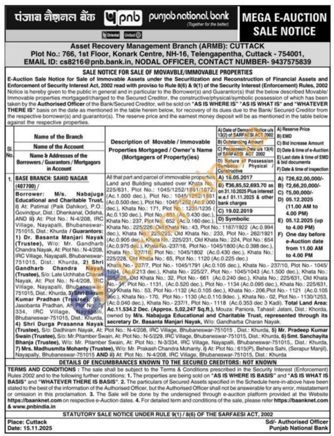 All that part and parcel of immovable properties Land and Building situated over Khata No.: 225/631, Plot No.: 1045/1252/1861/1872, (Ac.1.000 dec.), Plot No.: 1045/1252/1861 (Ac.0.500 dec.), Plot No.: 1045/1252 (Ac.2.000 dec.), Khata No.: 171, Plot No.: 1231/1235 ( Ac.0.130 dec.), Plot No.: 651 (Ac.0.430 dec.). Khata No.: 237, Plot No.: 652 (Ac.0.160 dec.).Khata No.: 225/226, Old Khata No.: 43, Plot No.: 1167/1922 (Ac.0.994 dec.), Khata No.: 225/225, Old Khata No.: 233, Plot No.- 262/1921 (Ac.0.905 dec.), Khata No.: 225/231, Old Khata No.: 224, Plot No.: 654 (Ac.0.975 dec.), Khata No.-237/16, Plot No.-1045/1800 (Ac.0.398 dec.). Khata No.: 237/18, Plot No.: 1045/1802 (Ac.0.430 dec.), Khata No.: 225/228, Old Khata No.: 65, Plot No.: 1120 (Ac.0.225 dec.) Khata No.- 237/7, Plot No. 1045/1791 (Ac.0.105 dec.), Khata No.- 237/10, Plot No.- 1045/1794, (Ac.0.213 dec.), Khata No. 225/27, Plot No. 1045/1043 (Ac.1.500 dec.), Khata No.: 225/526, Old Khata No.: 32, Plot No.-661 (Ac.0.240 dec.), Khata No.: 225/631, Old Khata No.-31. Plot No. 1131, (Ac.0.520 dec.), Plot No.- 1134 (Ac.0.095 dec.), Khata No.: 225/631, Old Khata No.: 53, Plot No.-1132 (Ac.0.105 dec.), Khata No.- 206, Plot No. 1121 (Ac.0.105) dec.), Khata No.- 170, Plot No.- 1130 (Ac.0.110.9dec.), Khata No.- 02, Plot No. 1130/1253, (Ac.0.040 dec.), Khata No.-237/1, Plot No. 1118 (Ac.0.353 dec 3 Kadi). Total Land Area: Ac.11.534.2 Dec. (Approx. 5,02,247 Sq.ft.), Mouza: Paniora, Tahasil: Jatani, Dist.: Khorda, owned by M/s. Nabajuga Educational and Charitable Trust, represented through its secretary Dr. Basanta Manjari Nayak, W/o: Gandharba Charan Nayak