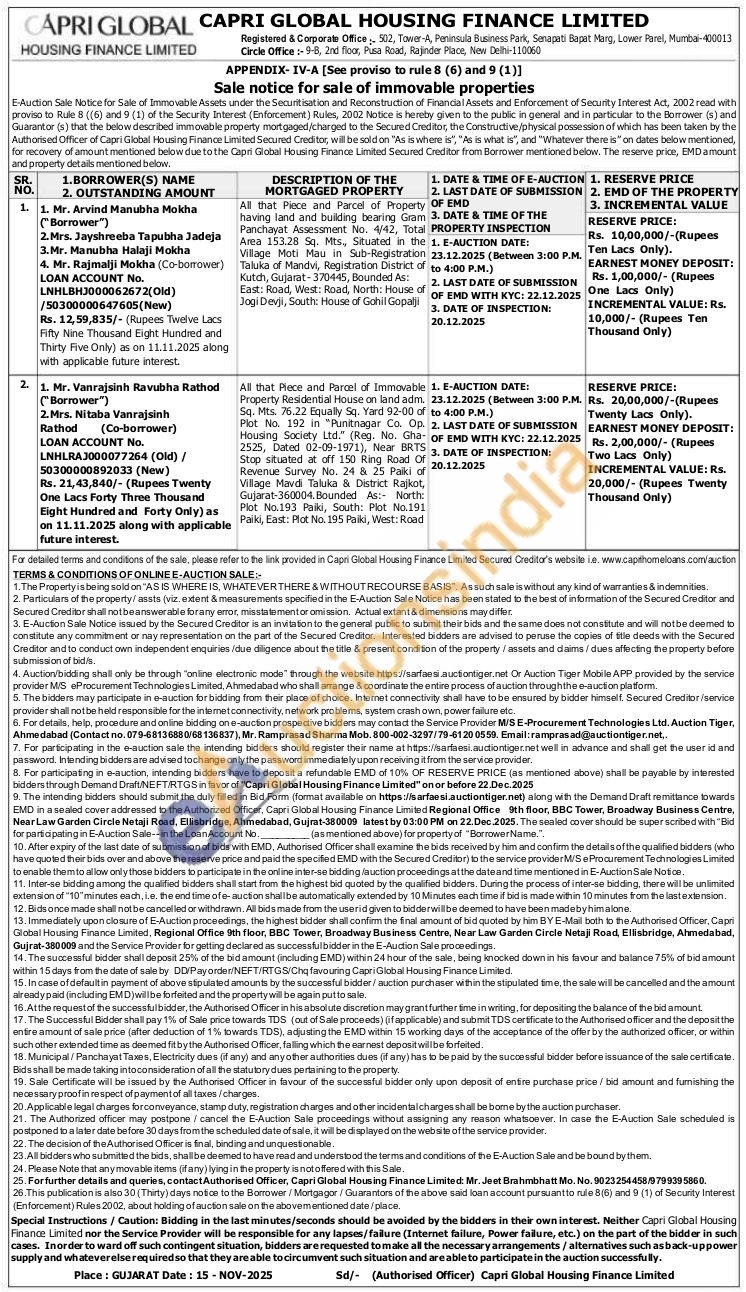 All that Piece and Parcel of Property having land and building bearing Gram Panchayat Assessment No. 4/42, Total Area 153.28 Sq. Mts., Situated in the Village Moti Mau in Sub-Registration Taluka of Mandvi, Registration District of Kutch, Gujarat-370445, Bounded As: East: Road, West: Road, North: House of Jogi Devji, South: House of Gohil Gopalji