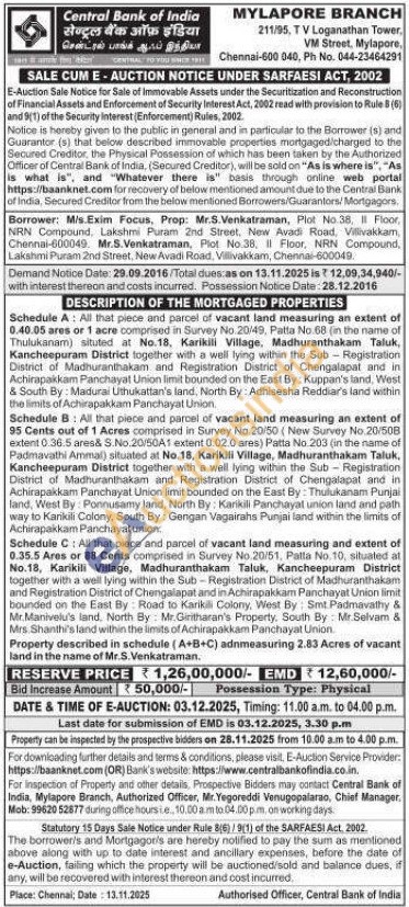 Schedule C: All that piece and parcel of vacant land measuring and extent of 0.35.5 Ares or 88 Cents comprised in Survey No 20/51, Patta No.10, situated at No.18, Karikili Village, Madhuranthakam Taluk, Kancheepuram District together with a well lying within the Sub-Registration District of Madhuranthakam and Registration District of Chengalapat and in Achirapakkam Panchayat Union limit bounded on the East By Road to Karikili Colony, West By: Smt Padmavathy & Mr. Manivelu's land, North By Mr.Giritharan's Property, South By: Mr.Selvam & Mrs. Shanthi's land within the limits of Achirapakkam Panchayat Union.